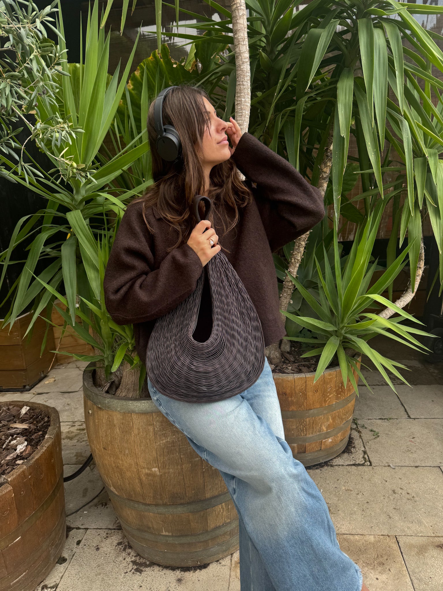 Using our fibers' elasticity and working with different densities, we shape the fabric without cutting the frame, generating volumes, or shapes that respect the threads' visual continuity. The finished piece respects the ergonomics of the body and transforms the accessory into a clothing piece close to the body.