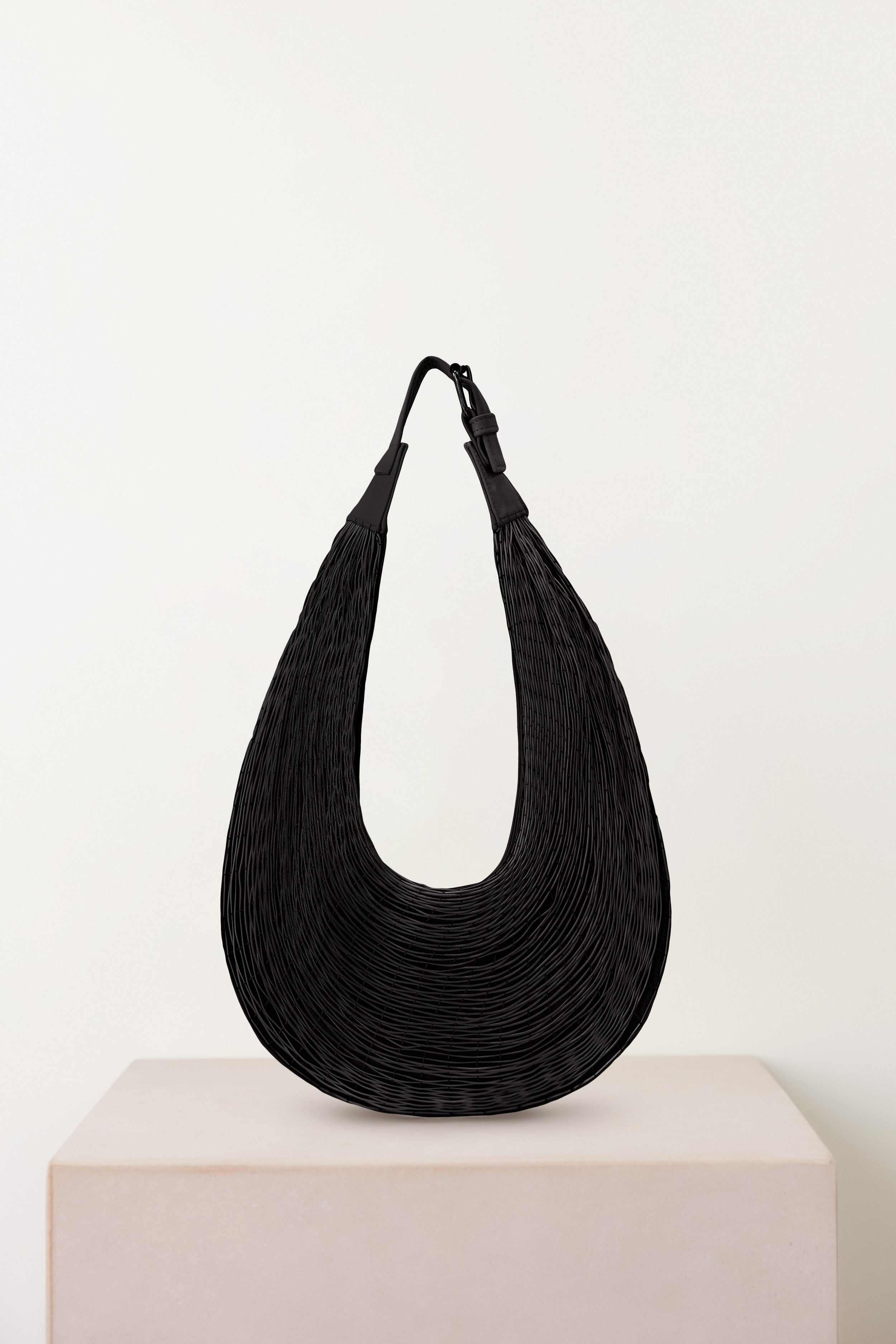 The triangular shape of the loom and the elasticity of the fiber with which it is woven gives rise to the rounded shape of the piece.