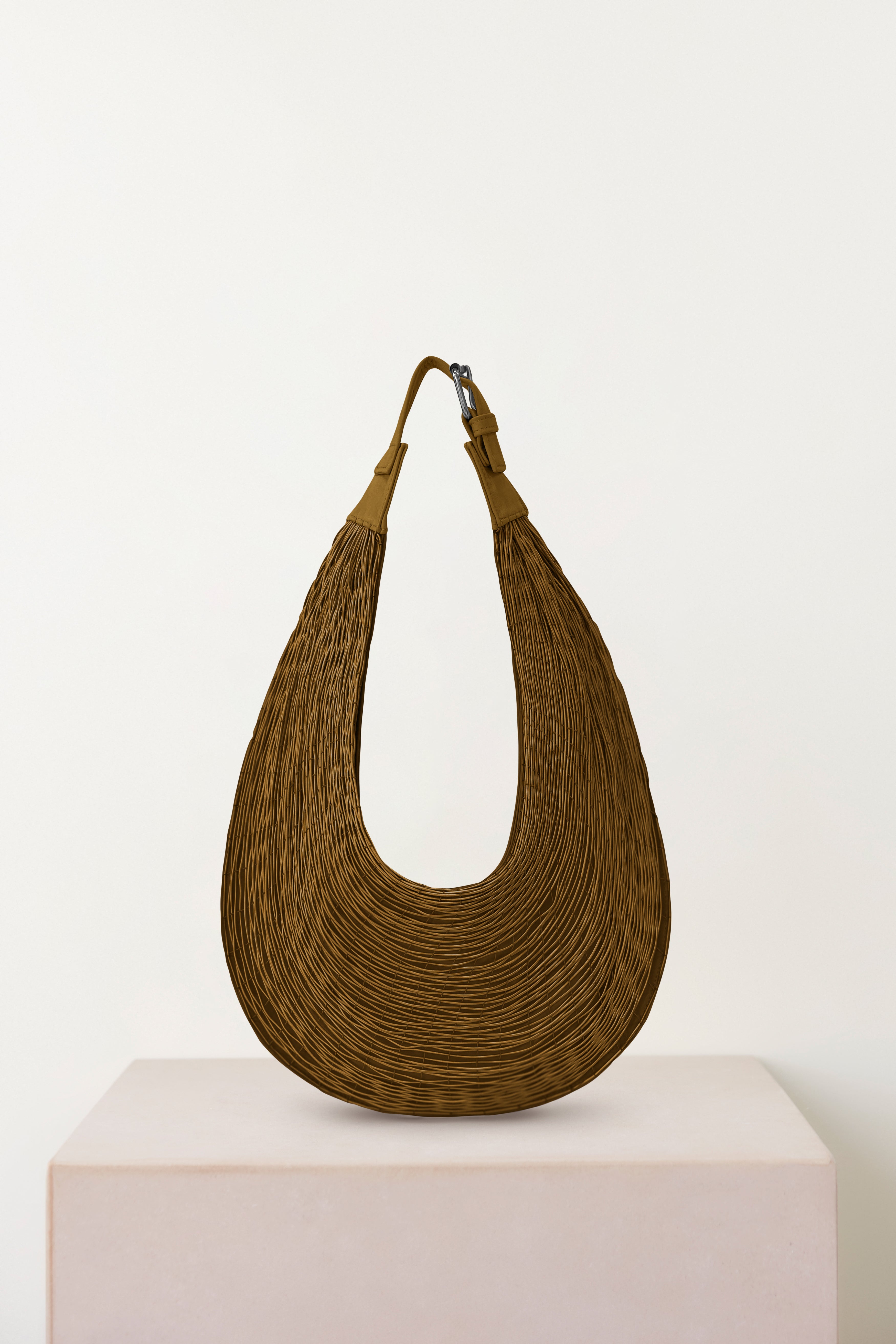 The triangular shape of the loom and the elasticity of the fiber with which it is woven gives rise to the rounded shape of the piece.