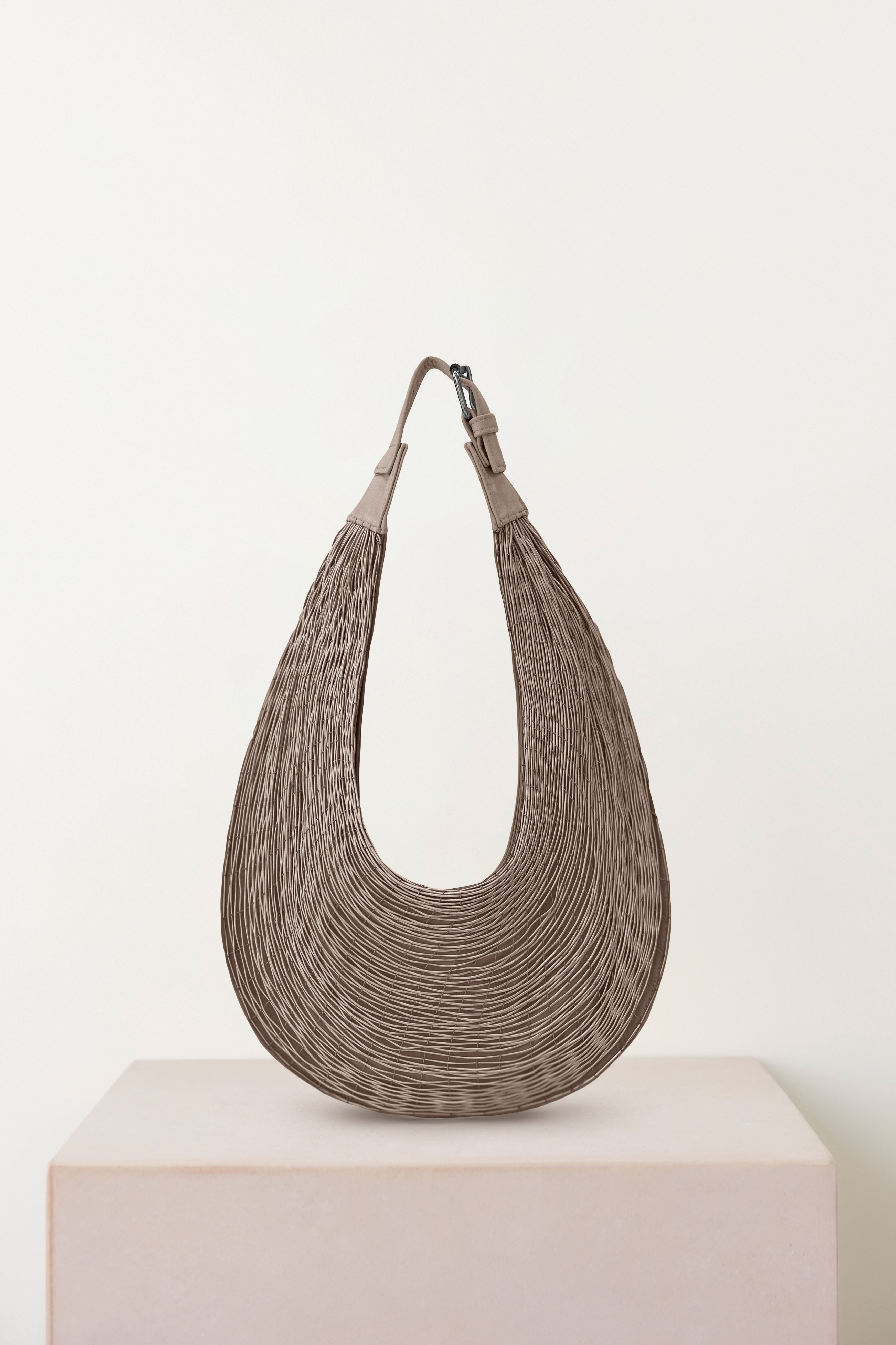 The triangular shape of the loom and the elasticity of the fiber with which it is woven gives rise to the rounded shape of the piece.