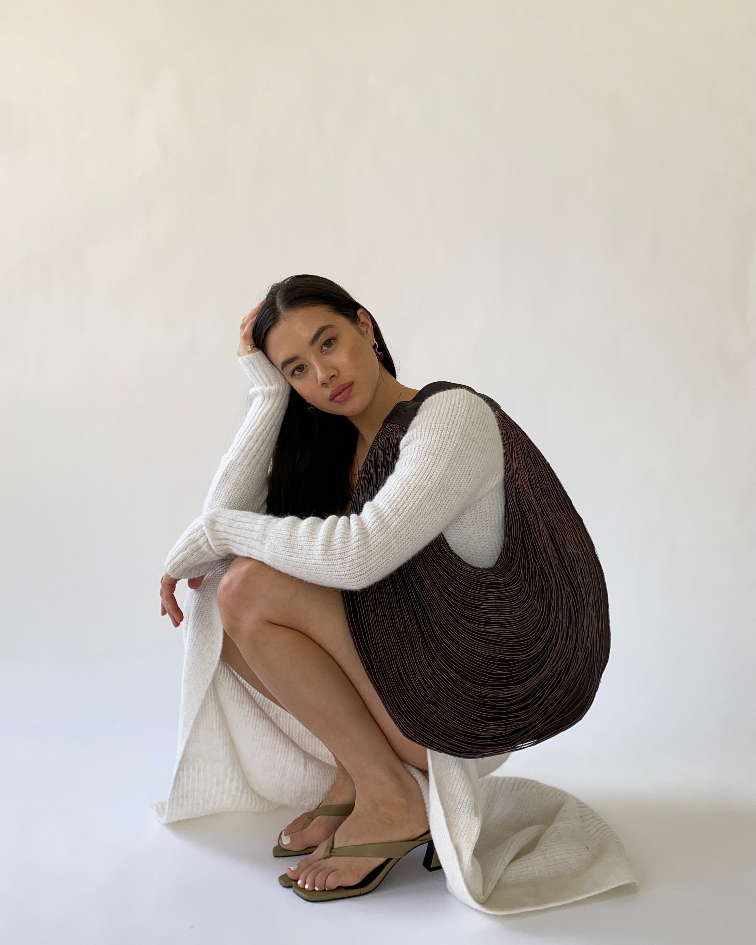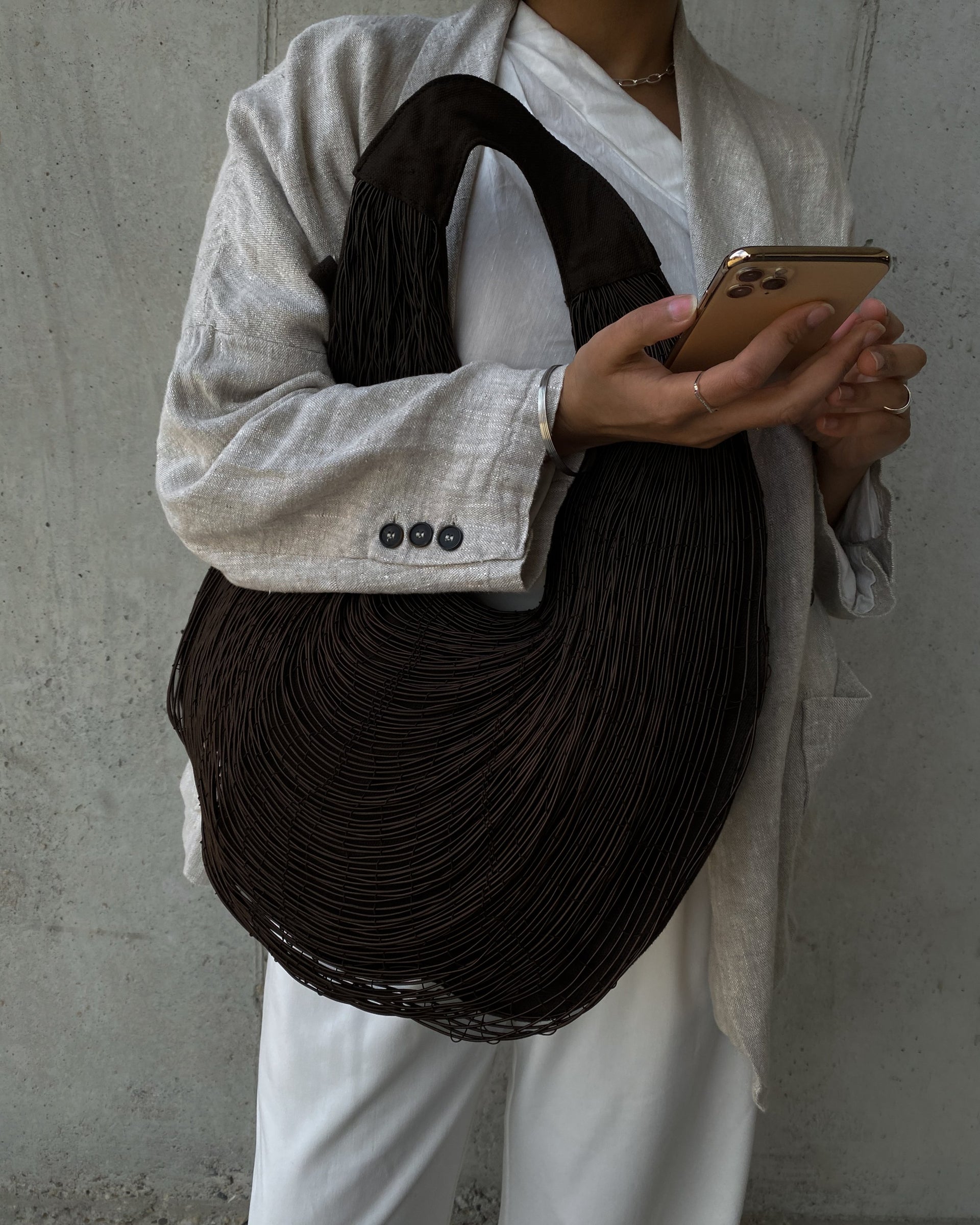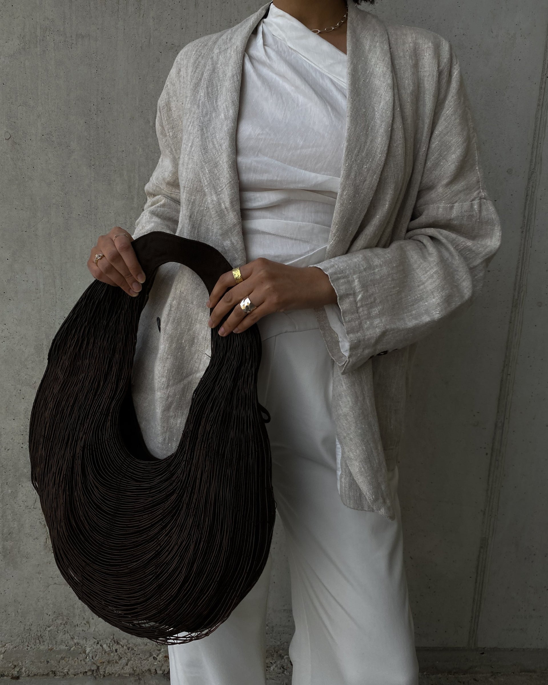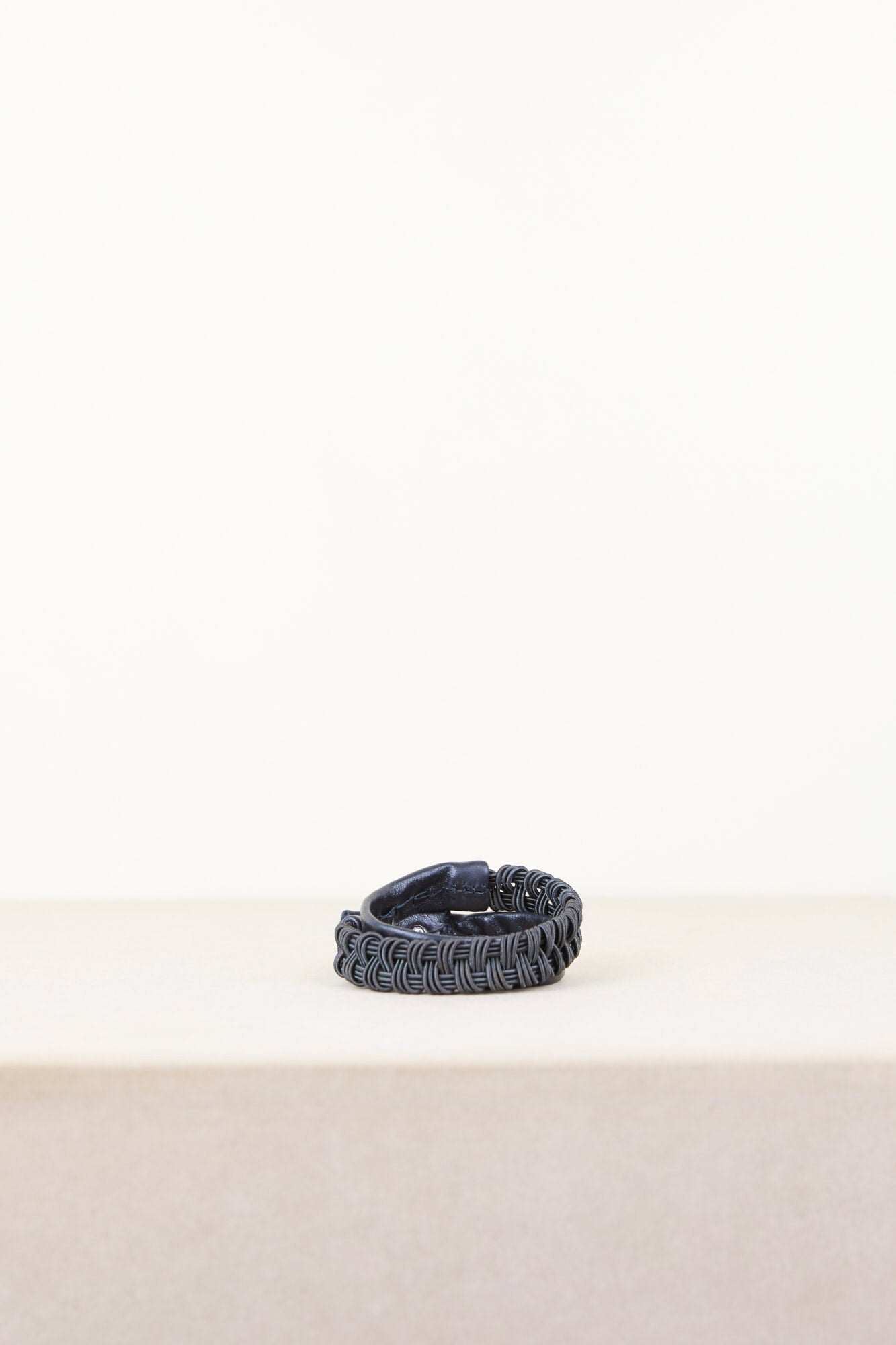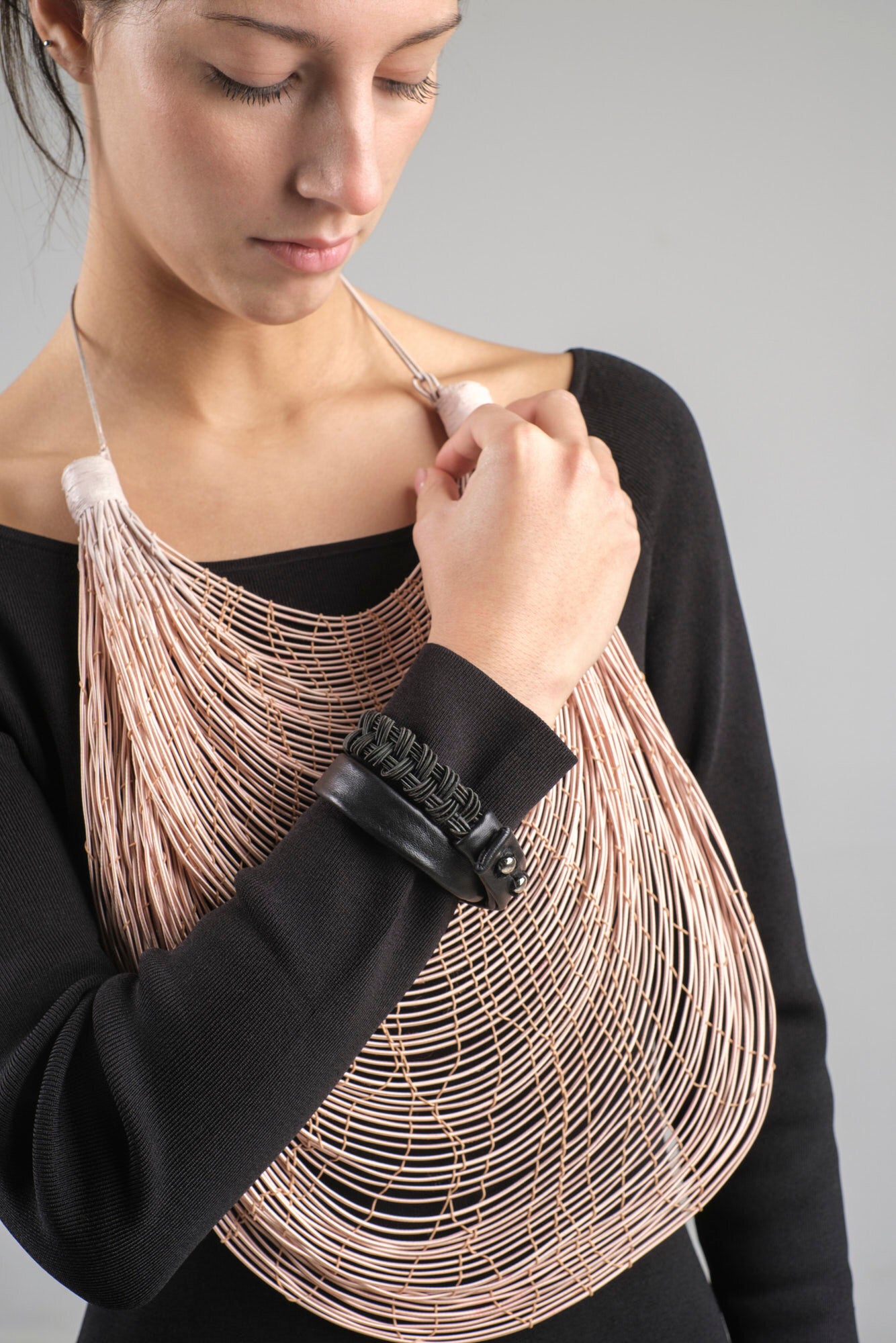 Hand-woven on a rectangular loom and hand-dyed "by piece", with lambskin finishes, to be worn alone or on the cuff of the shirt.