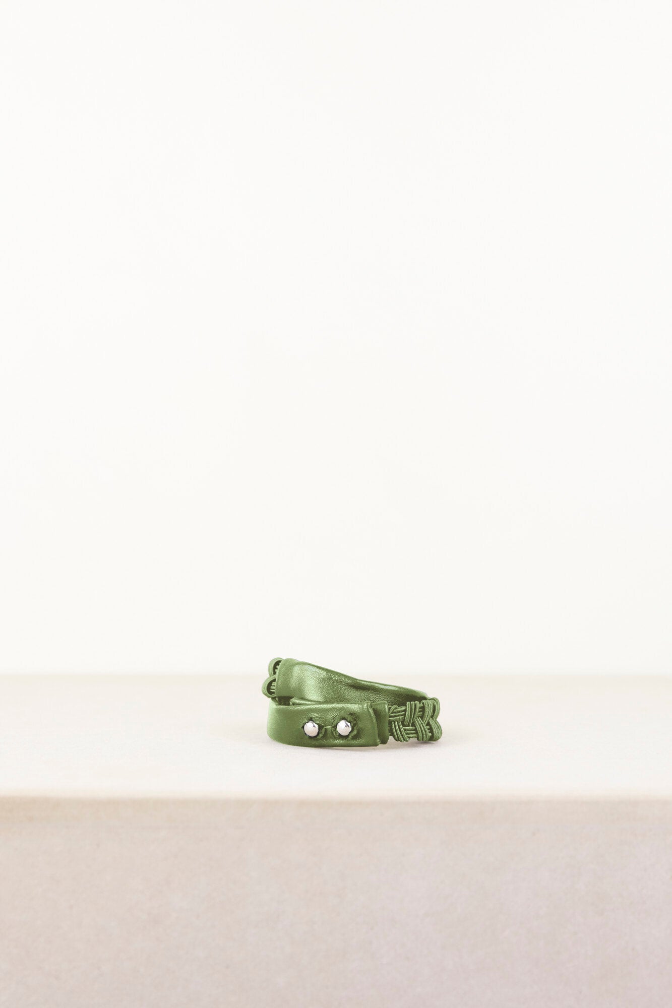 Hand-woven on a rectangular loom and hand-dyed "by piece", with lambskin finishes, to be worn alone or on the cuff of the shirt.