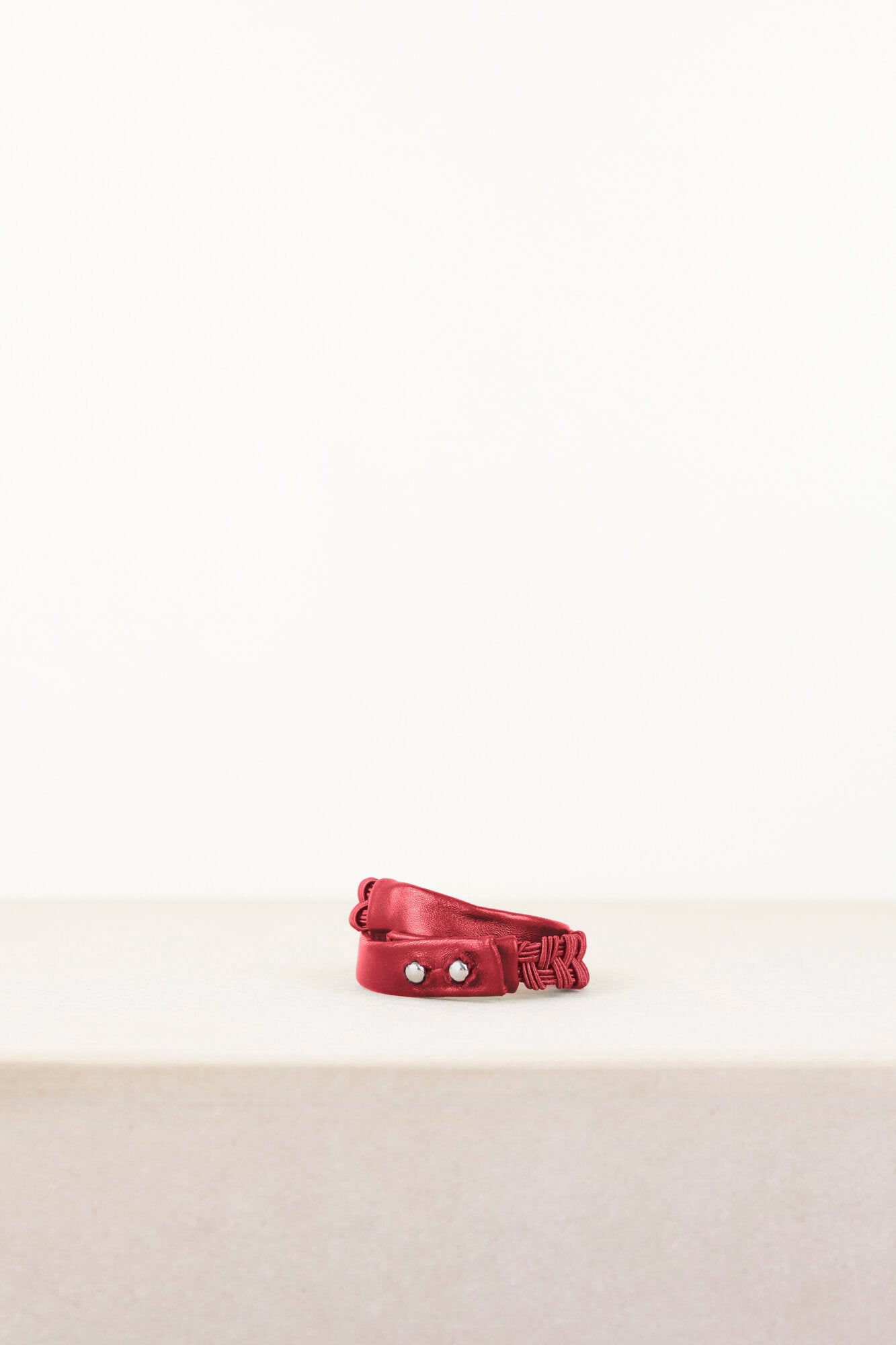 Hand-woven on a rectangular loom and hand-dyed "by piece", with lambskin finishes, to be worn alone or on the cuff of the shirt.