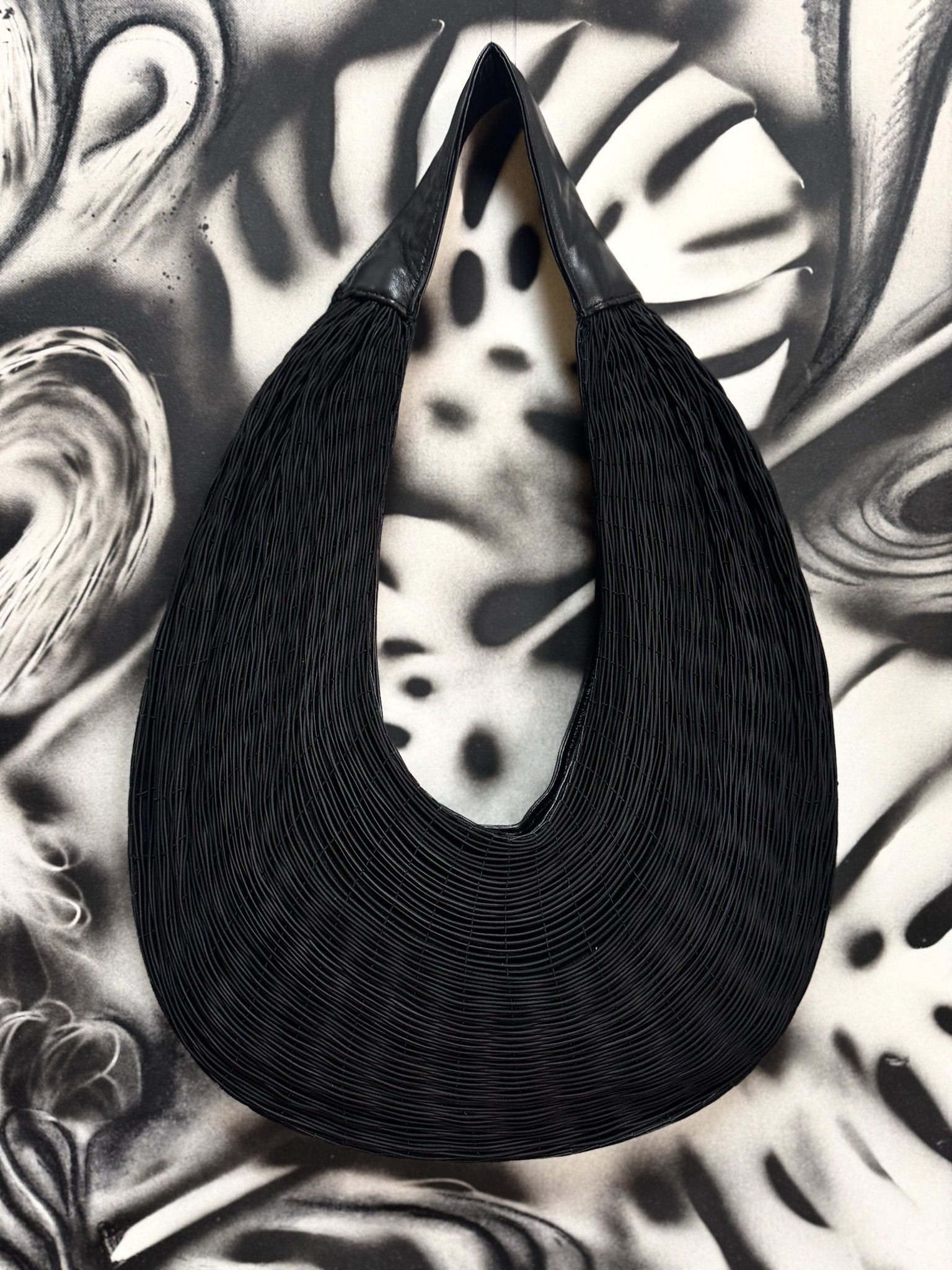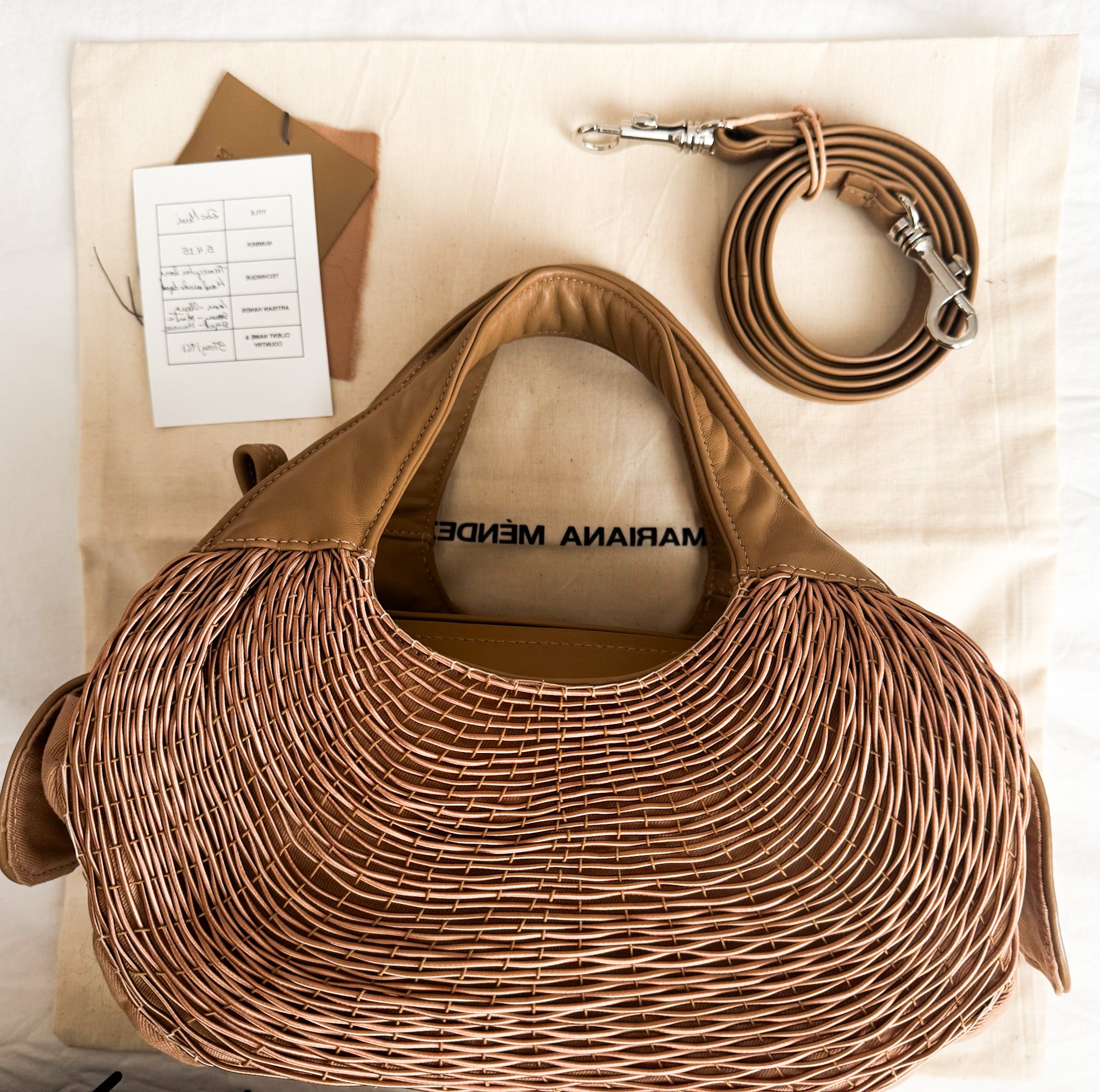 The triangular shape of the loom and the elasticity of the fiber with which it is woven gives rise to the rounded shape of the piece, which carries the name "Bivalda", in this case a “Doc bag” the most practical evening bag.