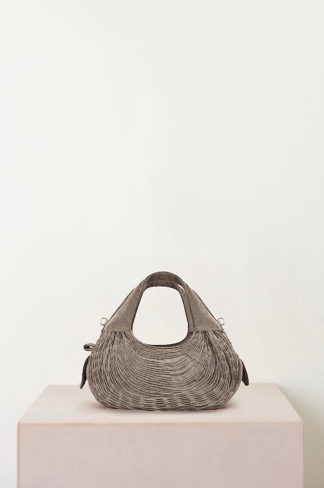The triangular shape of the loom and the elasticity of the fiber with which it is woven gives rise to the rounded shape of the piece, which carries the name "Bivalda", in this case a “Doc bag” the most practical evening bag.