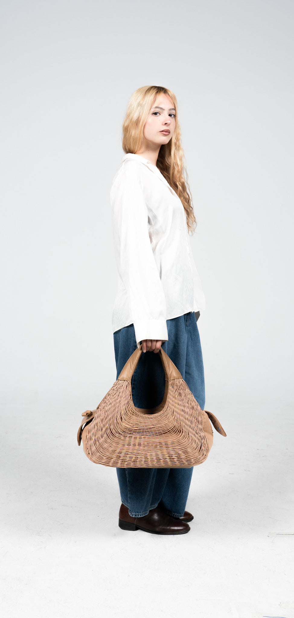 The same roundness of the iconic "Bivalda" shape achieved from our triangular loom is, in this case, taken to a utilitarian piece for day-to-day use, Especially for a versatile, active, and striking woman.