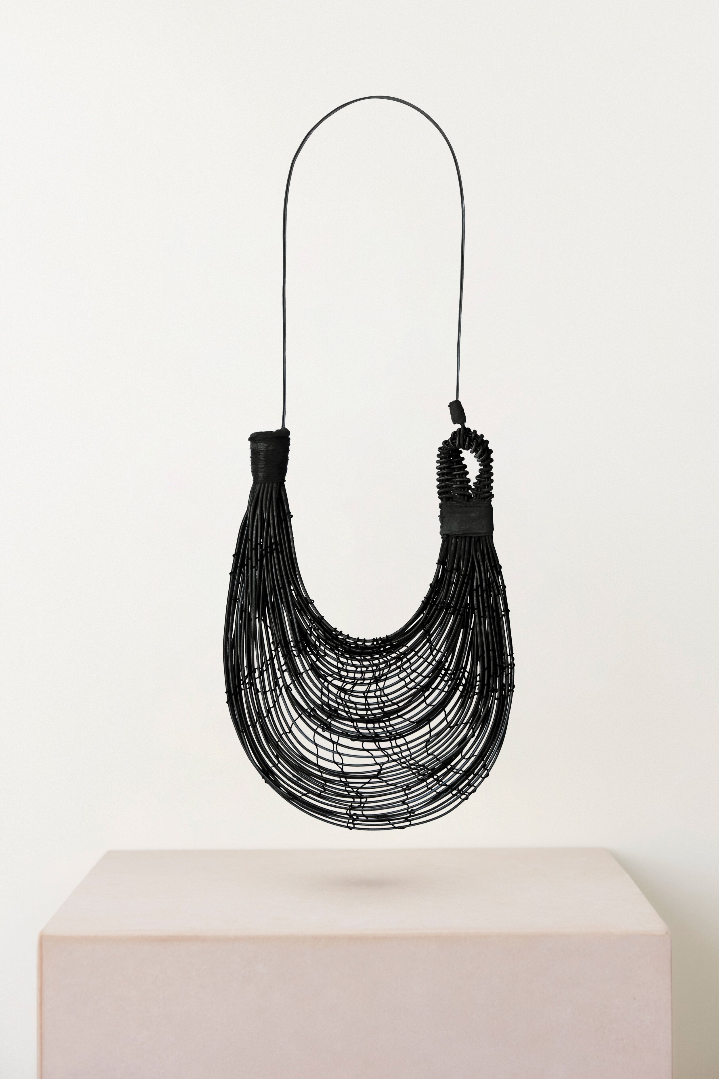 The piece has a a new adjustable closure to different heights depending on the type of collar your clothes wear. It is characterized by its lightness. Can be used more than one piece at the same time. The triangular shape of the loom and the elasticity of the fiber with which it is woven gives rise to the rounded shape of the piece.