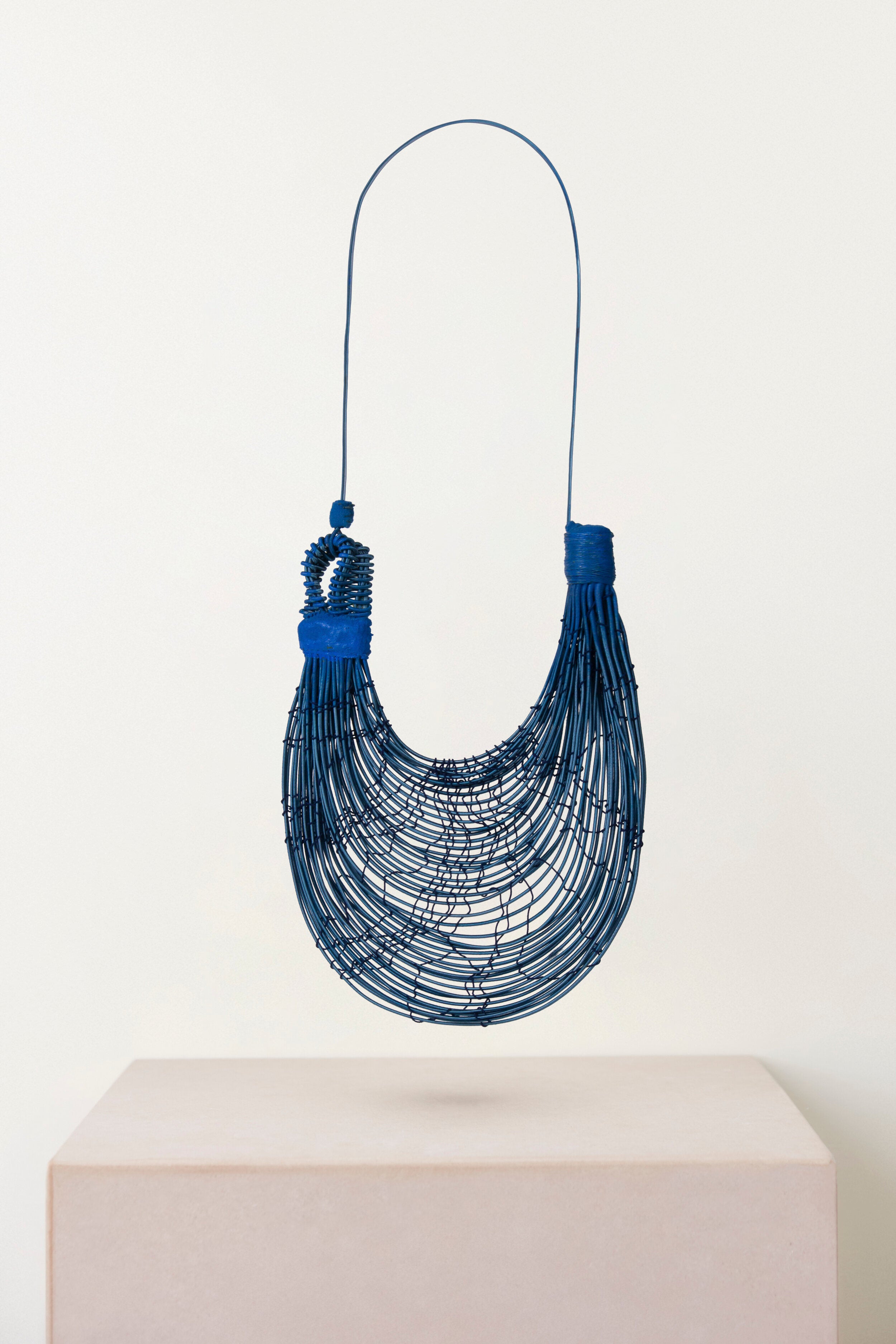 The piece has a a new adjustable closure to different heights depending on the type of collar your clothes wear. It is characterized by its lightness. Can be used more than one piece at the same time. The triangular shape of the loom and the elasticity of the fiber with which it is woven gives rise to the rounded shape of the piece.