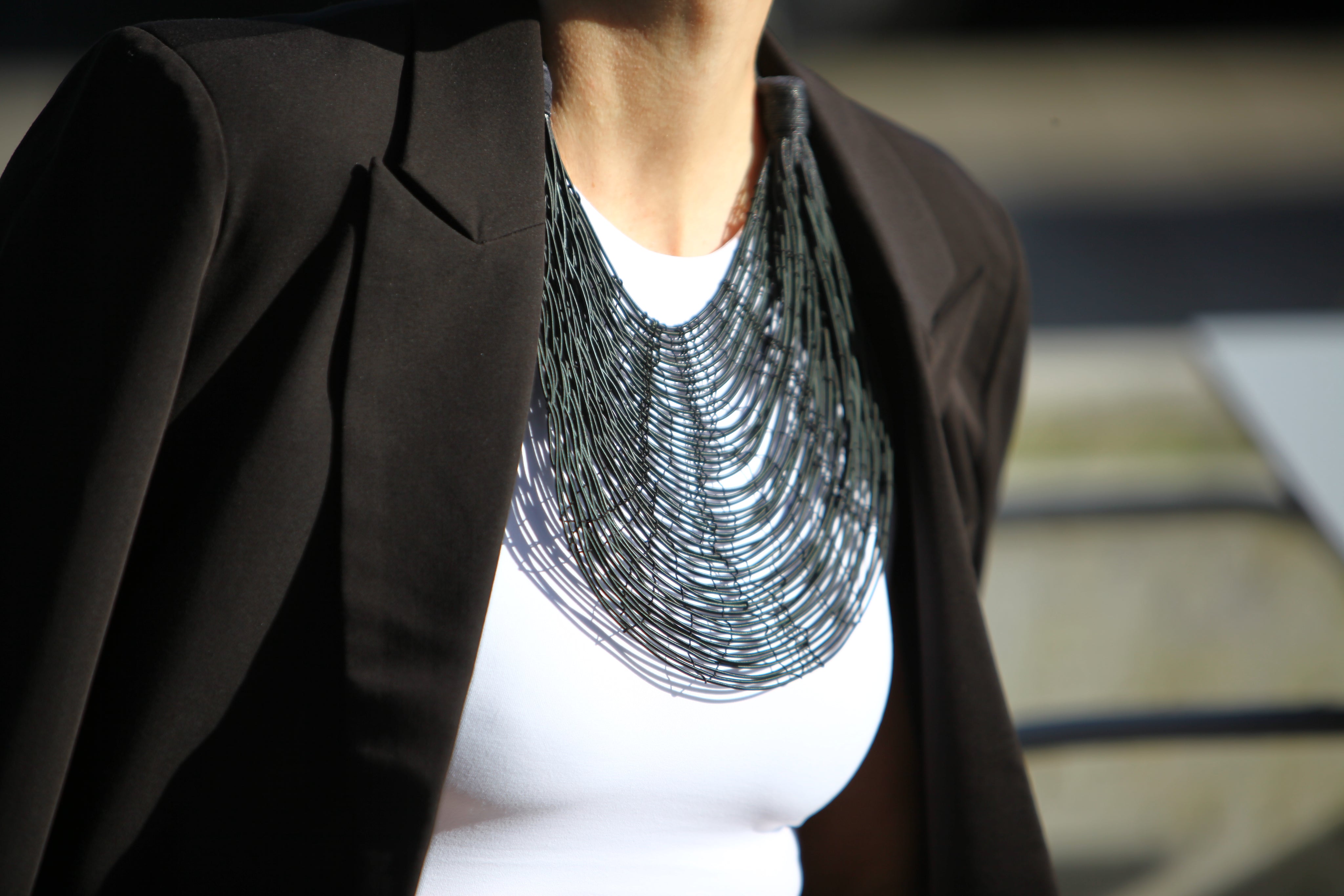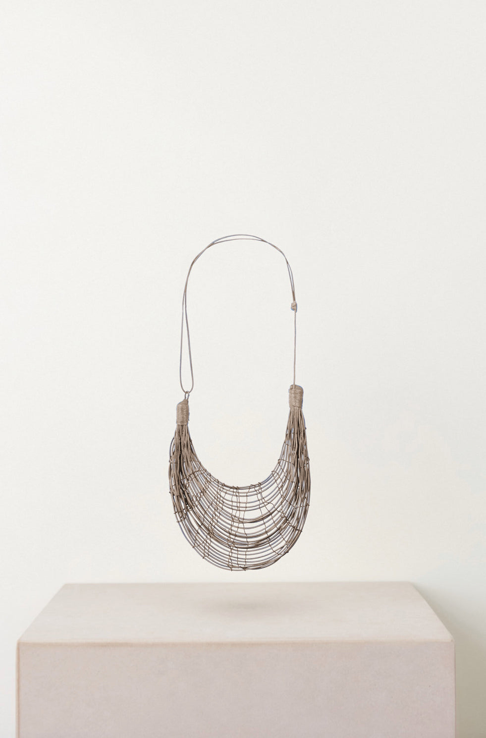The smaller size is ideal for everyday use and is adjustable to different heights depending on the type of collar your clothes wear, and It is characterized by its lightness. The triangular shape of the loom and the elasticity of the fiber with which it is woven gives rise to the rounded shape of the piece.