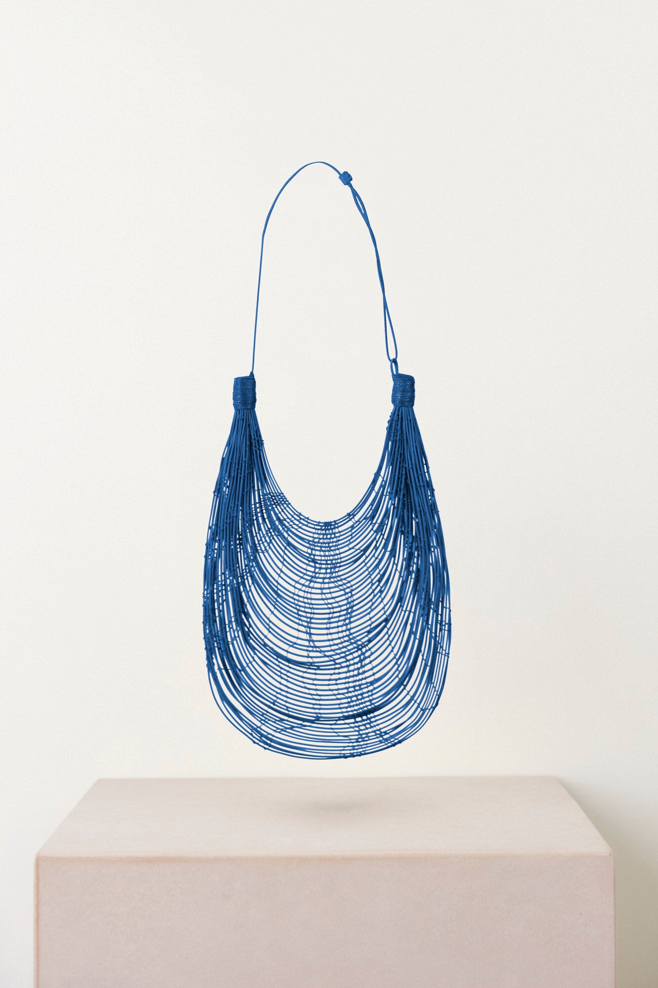 The smaller size is ideal for everyday use and is adjustable to different heights depending on the type of collar your clothes wear, and It is characterized by its lightness. The triangular shape of the loom and the elasticity of the fiber with which it is woven gives rise to the rounded shape of the piece.