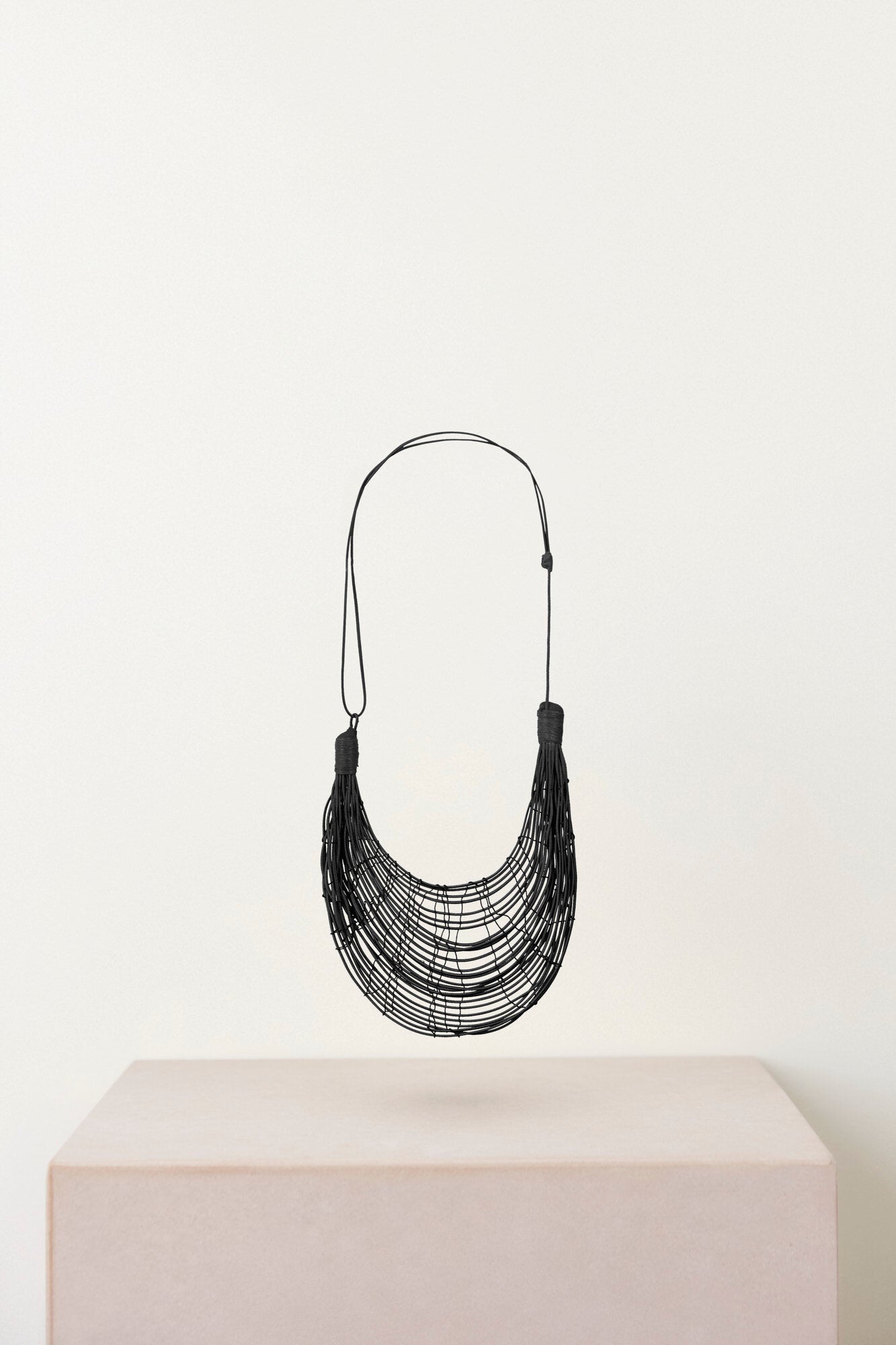 The smaller size is ideal for everyday use and is adjustable to different heights depending on the type of collar your clothes wear, and It is characterized by its lightness. The triangular shape of the loom and the elasticity of the fiber with which it is woven gives rise to the rounded shape of the piece.