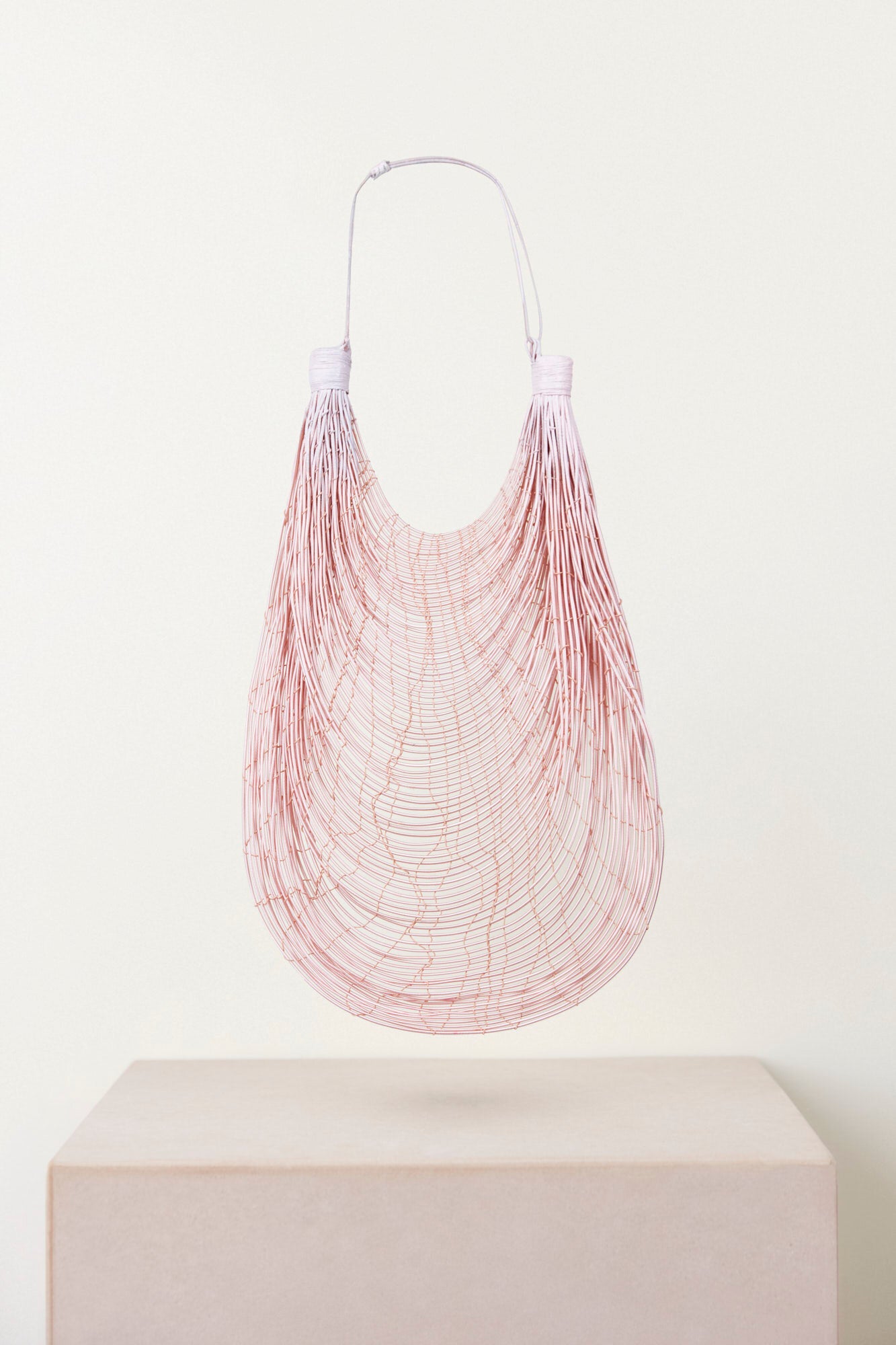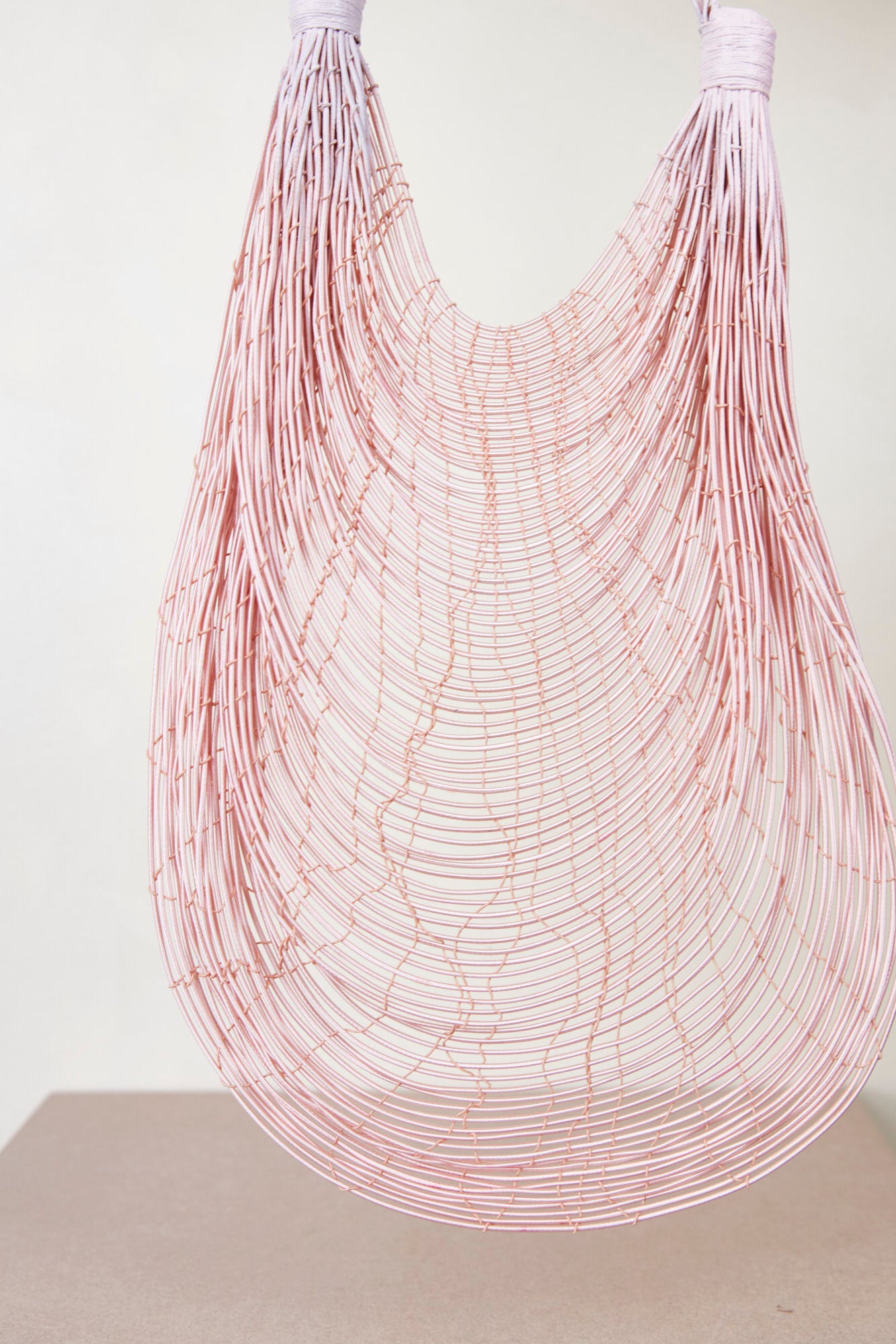 The piece is adjustable to different heights depending on the type of collar your clothes wear. It is characterized by its lightness. Can be used more than one piece at the same time. The triangular shape of the loom and the elasticity of the fiber with which it is woven gives rise to the rounded shape of the piece.