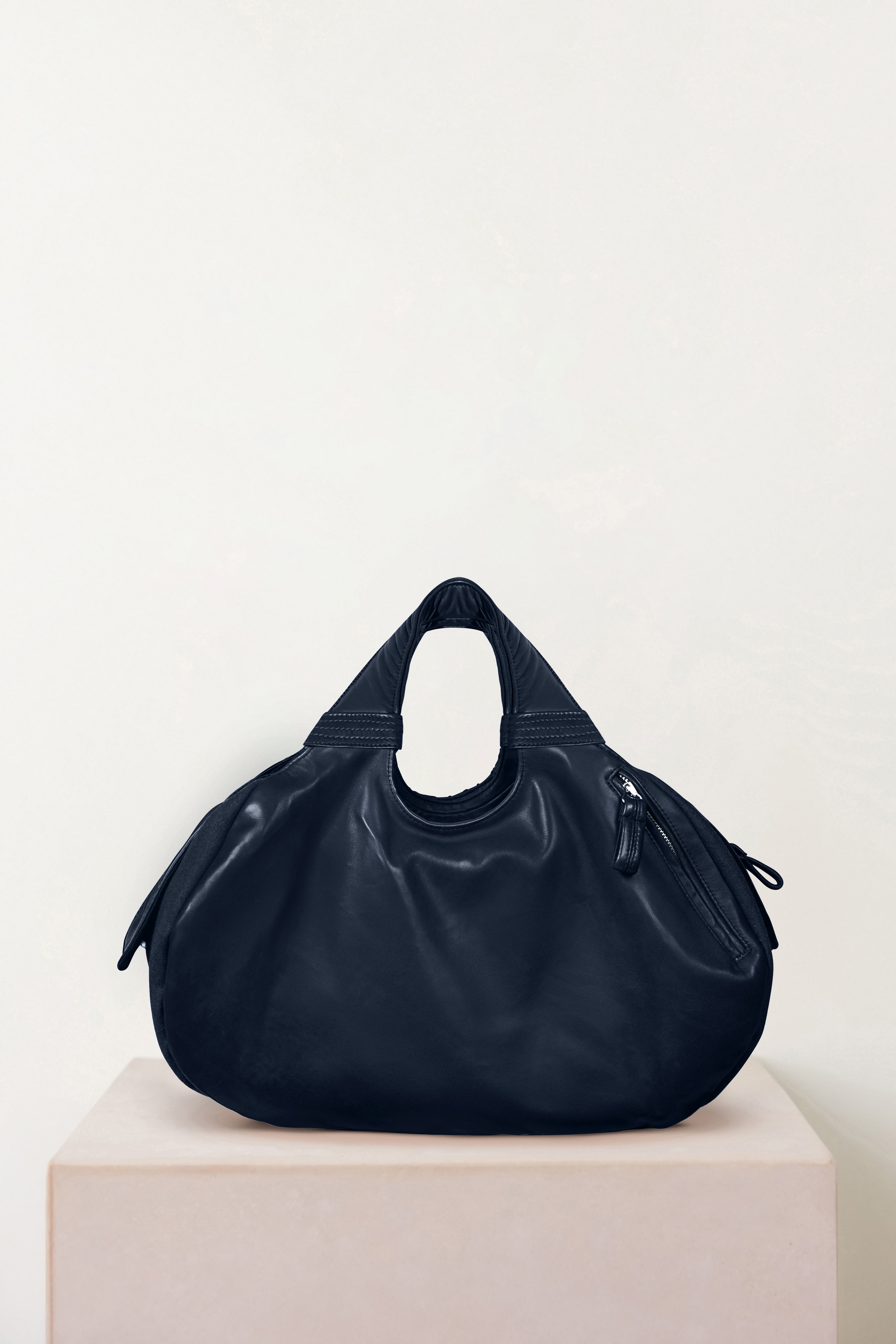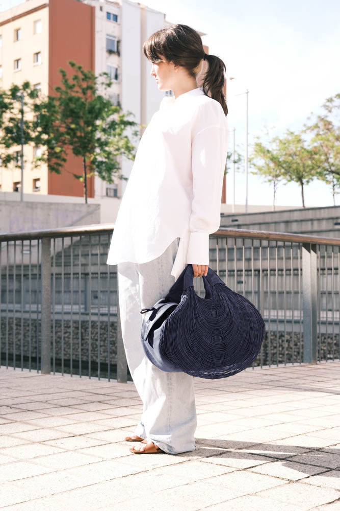The triangular shape of the loom and the elasticity of the fiber with which it is woven give rise to the rounded shape of the piece, which carries the name "Bivalda." In this case, it is a “Doc bag” with perfect sizes for a weekend bag.